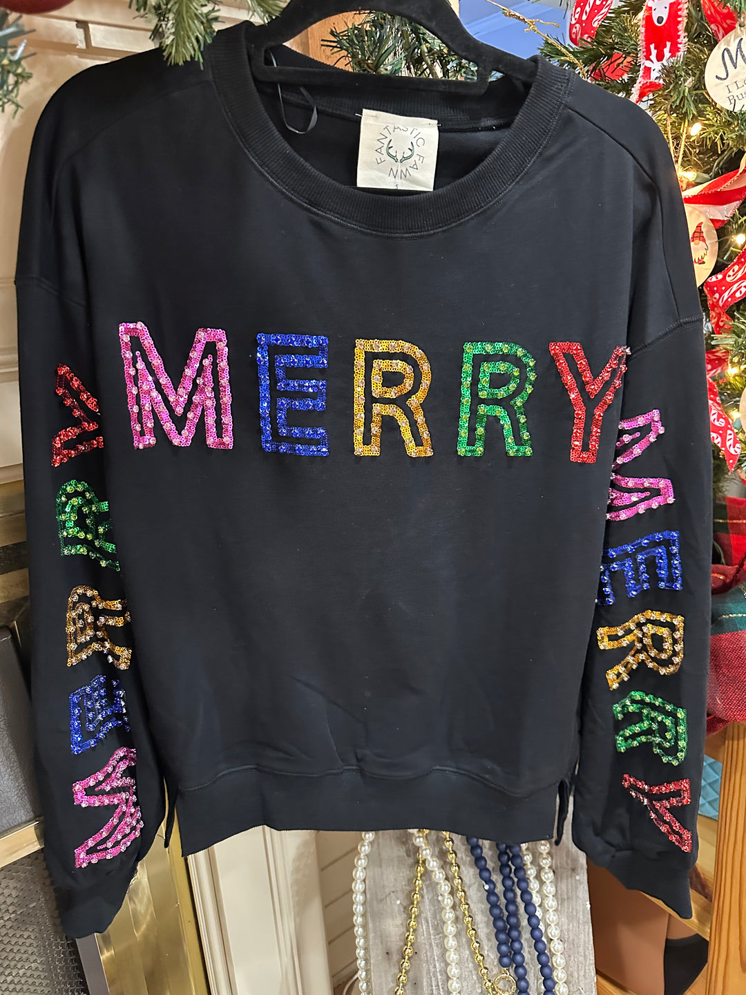 “Merry” Embroidered Holiday Sweatshirt - Sand
