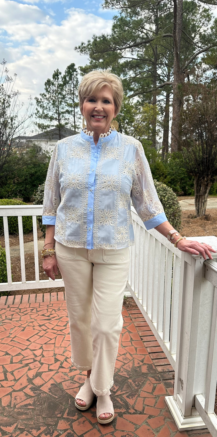 Add effortless elegance to your everyday wardrobe with this dreamy embroidered blouse! Featuring delicate 3D floral embroidery throughout, a soft button-down front, and charming scalloped trim along the neckline and cuffs, this top blends classic style with romantic detail. The lightweight sheer texture keeps it airy and perfect for spring and summer days, while the 3/4 sleeves offer flattering coverage.