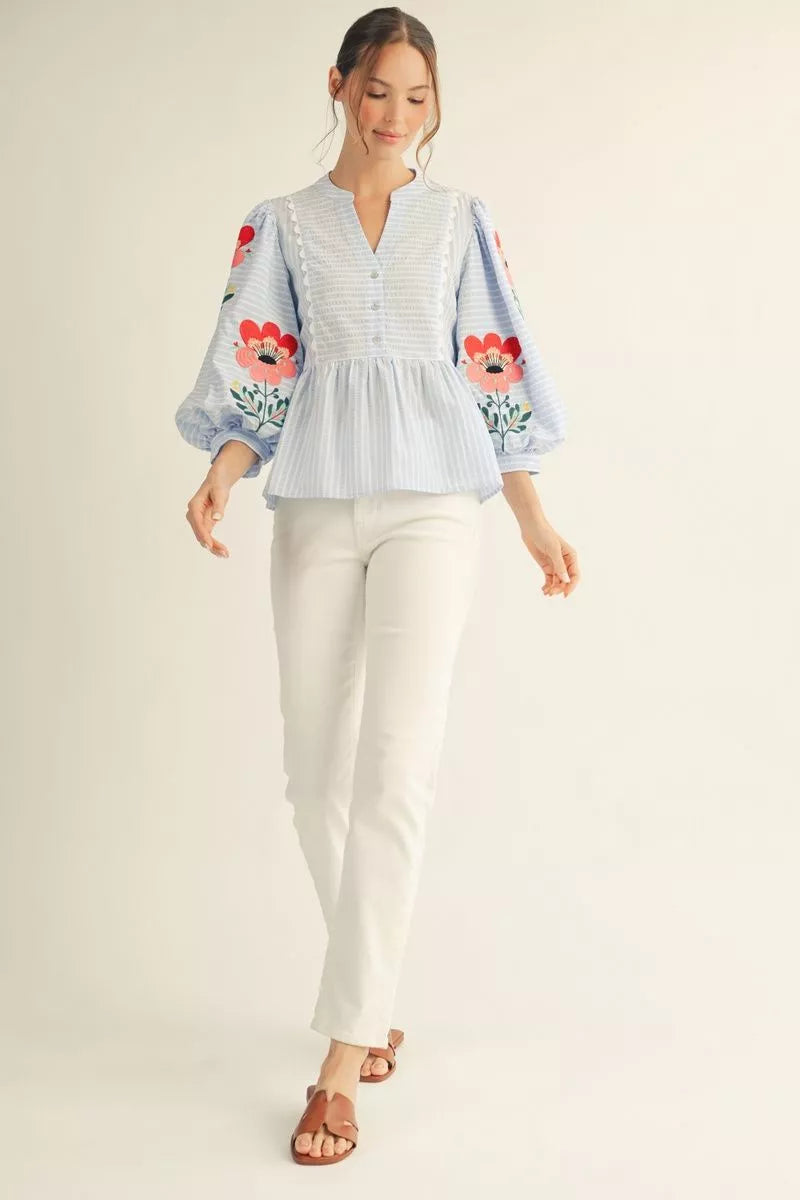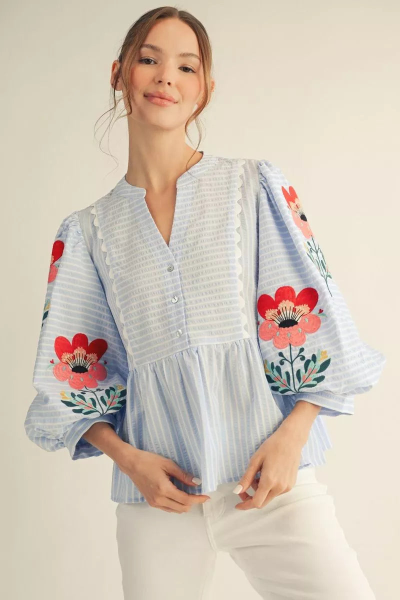 Sweet, feminine, and full of detail, the Bluebell Garden Peplum Top is a standout piece for spring and summer. Designed with soft vertical stripes, this top features 3/4 puff sleeves adorned with beautiful floral embroidery, a flattering peplum silhouette, and delicate scallop trim details. The front button-up design adds a classic touch, making it both charming and wearable.
