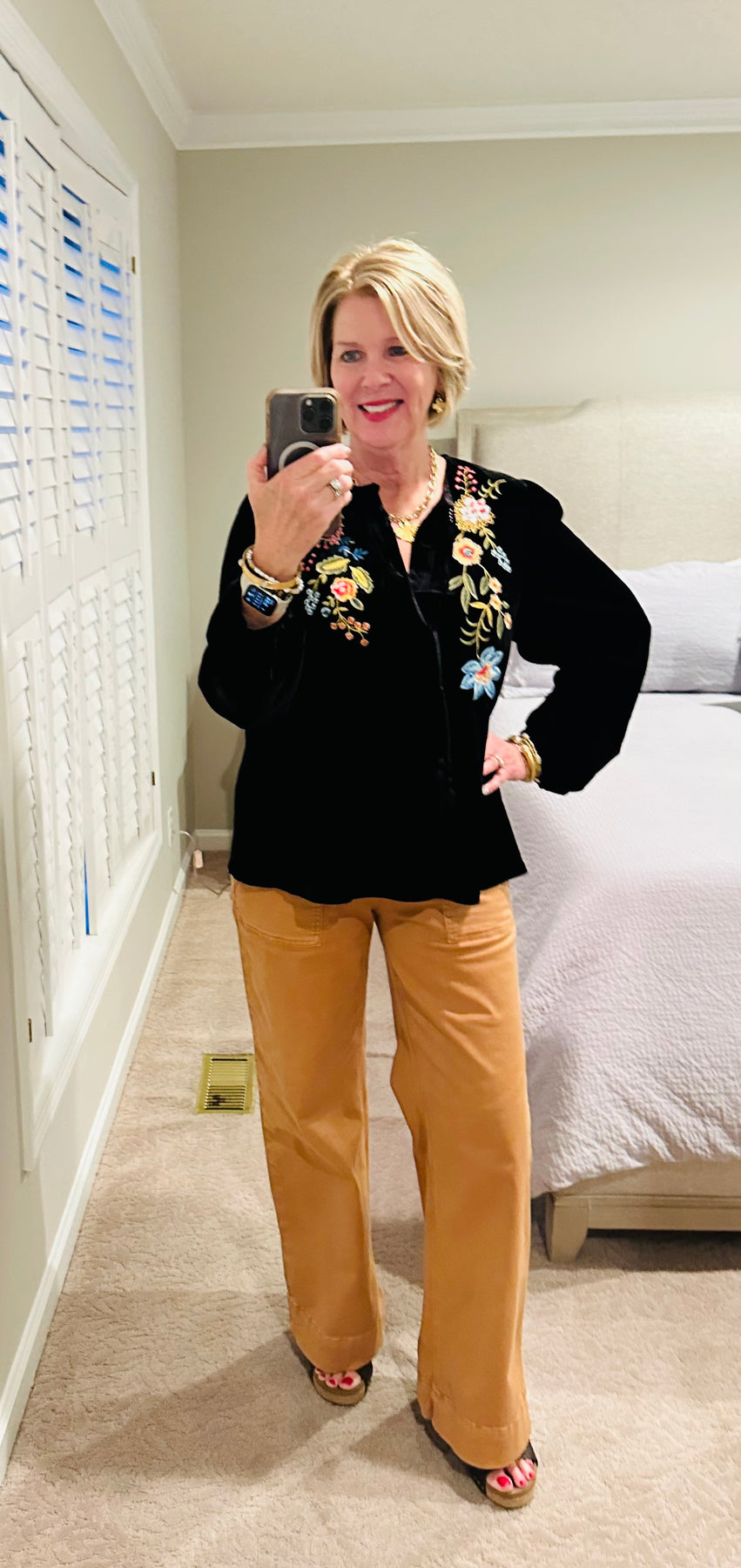 A touch of boho charm meets timeless elegance in this floral embroidered velvet top. The rich olive green hue and soft velvet texture make it a standout piece for the season. Features long sleeves, a relaxed peasant silhouette, and tassel tie neckline for a flattering, effortless look.