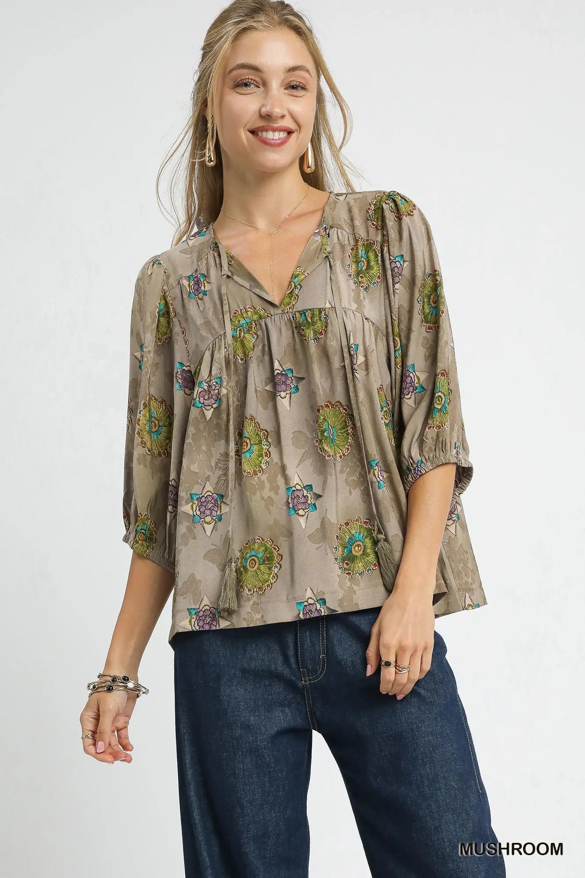 Elevate your everyday style with our Woodland Bloom Boho Top, a beautifully detailed blouse featuring an earthy mushroom backdrop and vibrant floral embroidery-inspired prints. The split V-neckline is finished with soft tassel ties for a relaxed, bohemian touch, while the 3/4 sleeves add effortless comfort and flow. Lightweight and easy to wear, this top pairs perfectly with denim, cords, or your favorite fall neutrals.