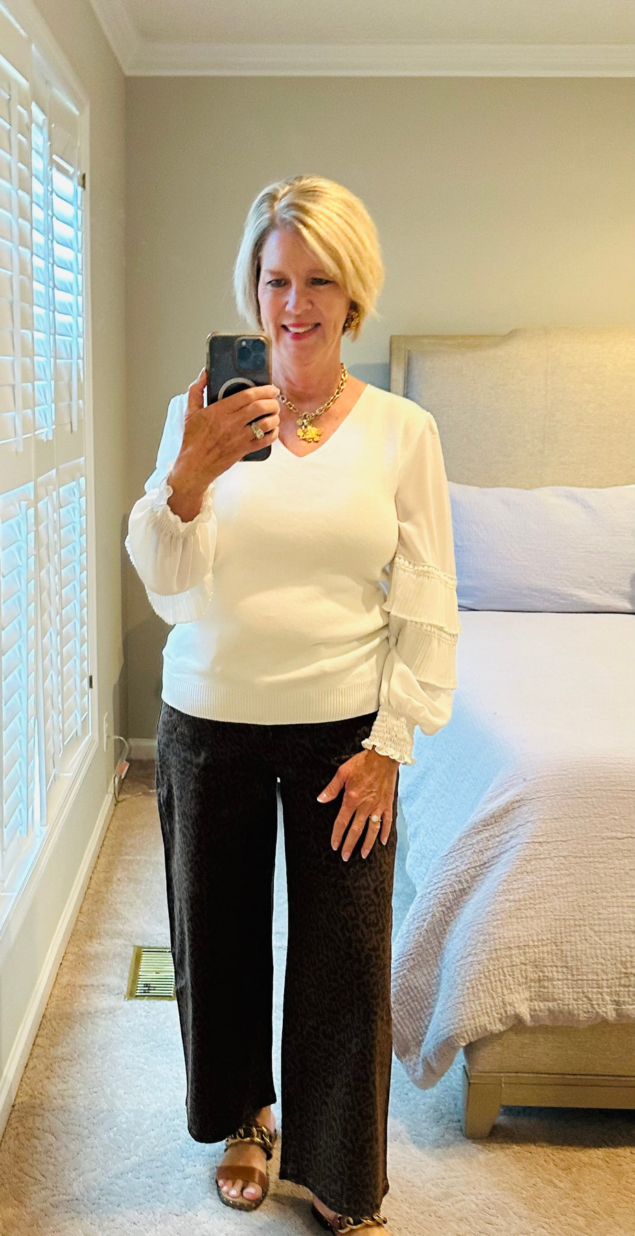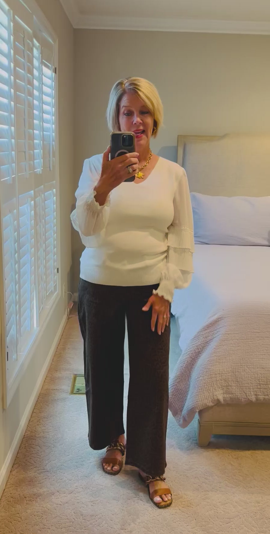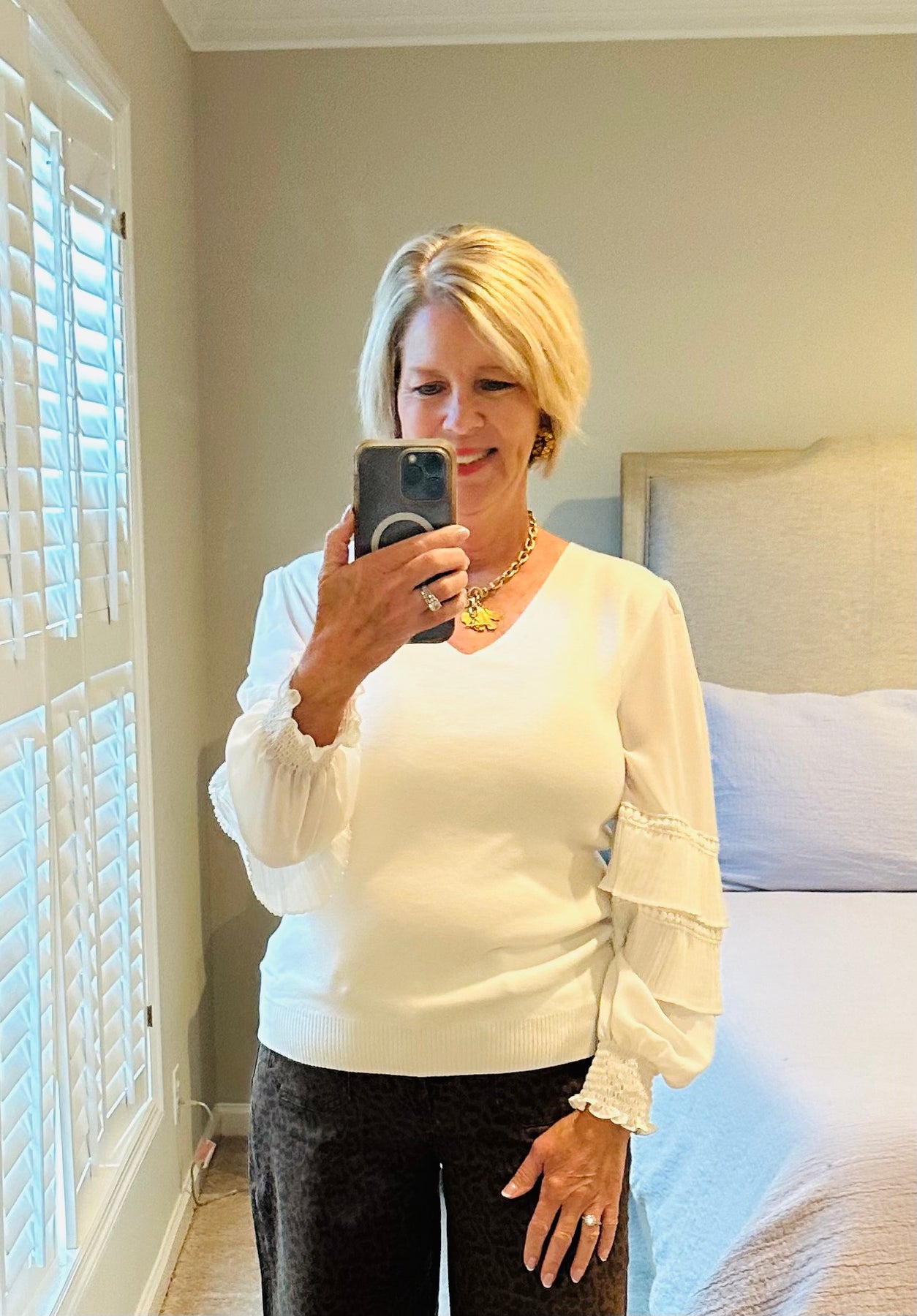 Bring elegance to your everyday style with the Ivory Dreams Sweater by Fate. This mixed media design blends a soft knit body with sheer chiffon sleeves, pleated detailing, and smocked cuffs for a touch of romance. With its flattering V-neckline and versatile silhouette, it’s the perfect piece to dress up denim or pair with tailored pants.