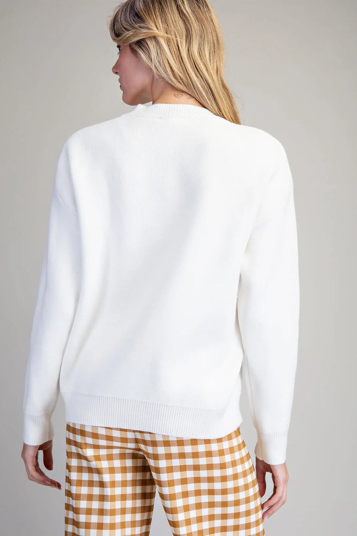 Celebrate the season in cozy, whimsical style with this festive holiday pullover. Designed with a relaxed fit and classic crew neckline, this soft knit sweater features dropped shoulders, ribbed trim, and a playful tinsel-embroidered Christmas tree front motif—complete with bright red ornaments and a sparkling gold star topper. It’s the perfect blend of comfort and cheer for all your holiday events!