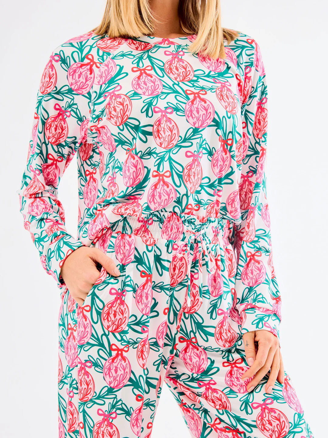 Introducing our Holiday Annie Pajama Set, where comfort meets festive charm. Perfect for sipping cocoa by the tree or enjoying Christmas morning in cozy style, this pajama set brings holiday cheer to every moment. Featuring a long-sleeve top with a classic crew neckline and straight-leg pants with an adjustable drawstring, our Annie Pajama Set combines classic holiday style with all-day comfort.