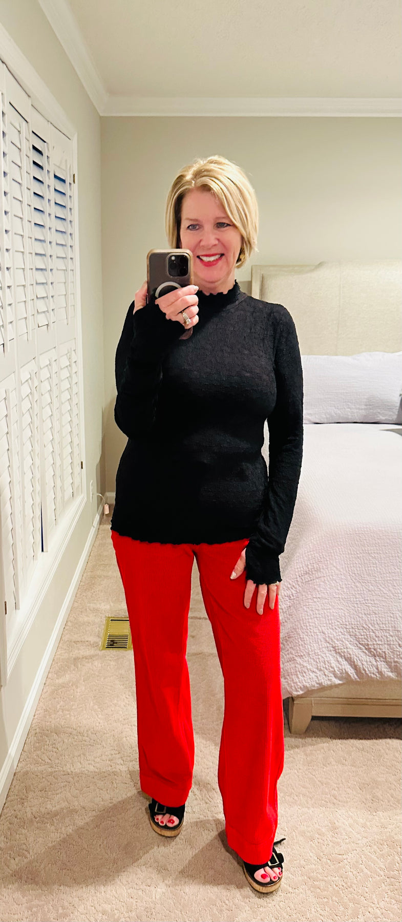 Meet your new layering essential! This fitted lace top features a delicate mock neckline, long sleeves with cozy thumbholes, and a soft merrow-trim edge for a feminine finish. Stretchy, lightweight, and flattering — perfect alone or layered under jackets, vests, and cardigans.