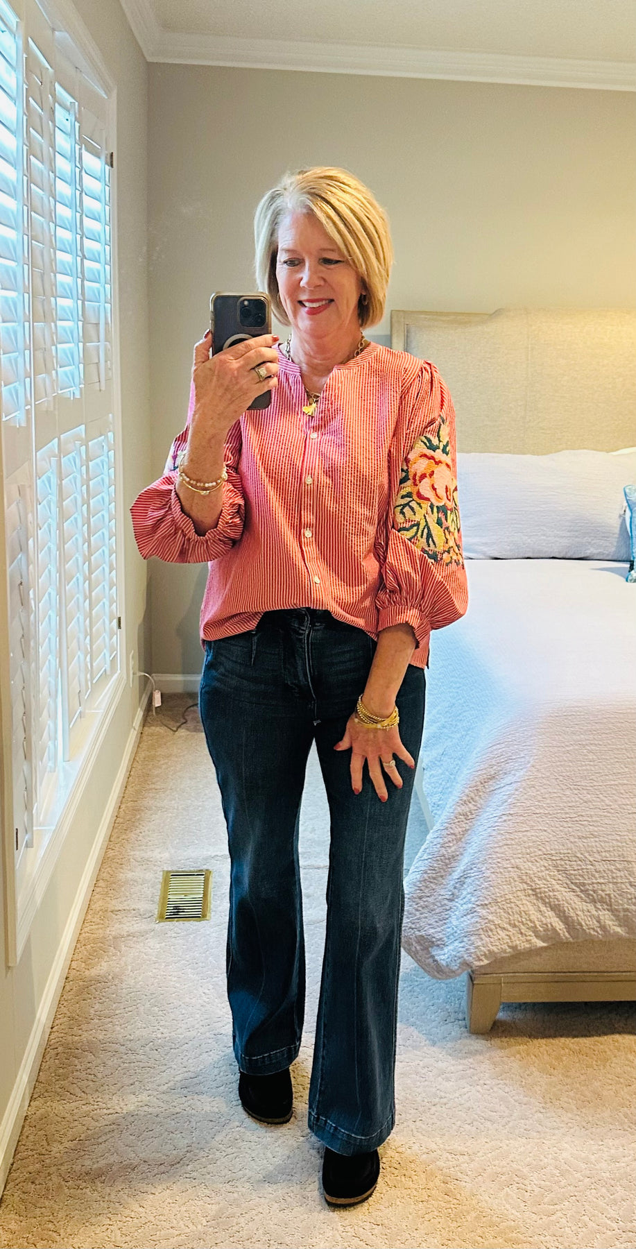 Fresh, feminine, and full of detail, this button-down blouse is the perfect statement piece. Designed with subtle vertical stripes, it features embroidered floral designs on the puff sleeves for a bold pop of color. The relaxed silhouette includes slightly slit sides for comfort and movement, making it easy to dress up or wear casually.
